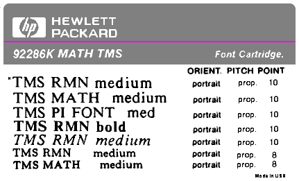 *All fonts are available in ASCII (ISO 6), DeskTop, ECMA-94 Latin 1, Legal, Math-8, Microsoft Publishing, PC-8, PC-8 DN, PC-850, PiFont, PS Math, PS Text, Roman-8, Ventura International, Ventura Math, Ventura U, and Windows symbol sets.
